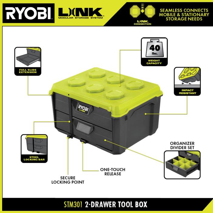 リョービ リンク モジュラー ストレージ システムは、ストレージ業界に革命をもたらし、日常生活の整理、アクセス、持ち運びを可能にします。リョービリンクの2段引き出しツールボックスは、最も厳しい状況でも工具を保管できます。耐衝撃性素材と40ポンドの耐荷重を備えています。収納可能なスチール製ロックバーと安全なロックポイントでポータブルツールストレージを簡単に保護します。フルエクステンションスライドはスムーズな操作を提供し、付属のオーガナイザーディバイダーセットはリョービツールを最大限に整理整頓し、小さな部品を所定の位置に保ちます。リョービリンクのモバイルストレージアイテムにシームレスに積み重ねられます。これはあなたのモバイルツールボックスのラインナップに加えるのに最適です。何よりも、これは同じLOを使用するRyobi Linkモジュラーストレージシステム製品ラインの一部です。モバイルストレージと据え置き型ストレージのニーズをシームレスに接続するためのッキングテクノロジー。リョービ リンク モジュラー ストレージ システムでスペースを所有しましょう。