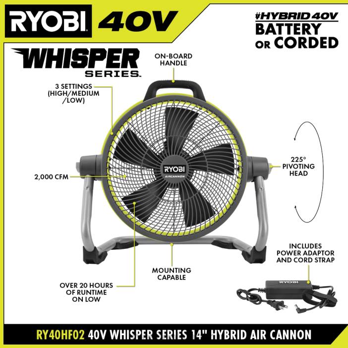 ryobi 40v ハイブリッド ウィスパー シリーズ 14 インチ空気砲を使用して、ryobi 40v システムを拡張します。このファンは 2,000 cfm を超える最大の冷却能力を備えていると同時に、ウィスパー シリーズの一部でもあります。 : 騒音を低減する高度な技術を利用した当社の最も静かな製品群の一部です。3 つの設定 (高/中/低)、225 度のピボットヘッド、毎回正確な空気配置のための取り付けオプションを通じてエアフローをカスタマイズします。追加のボーナスとして、付属のバレル プラグ電源アダプター (一体型コード ストラップ付き) により、無制限の実行時間を提供します。この 40V ハイブリッド ウィスパー シリーズ 14 インチ空気砲はリョービの 3 年間メーカー保証が付いており、(1) ry40hf02 40V ハイブリッド ウィスパー シリーズ 14 インチ空気砲が含まれています。ファン、バレルプラグ電源アダプター (1)、および取扱説明書、バッテリーおよび充電器ゲルは別売りです。