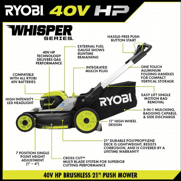 リョービ 40v hp ブラシレス 21 インチ ウィスパー シリーズ マルチブレード コードレス芝刈り機は、ガスのパワーとコードレスの利便性を提供します。プレミアム hp ブラシレス モーターは、より多くのパワー、より長い稼働時間を提供し、モーターの寿命が長くなります。ボタンを押すだけで始動し、最大 3/4 エーカーの庭に最適です。デュアル アクティブ バッテリー ポートと 2 つの 40v 6ah バッテリーを備えており、最長 70 分間の稼働時間を実現します。ささやきシリーズファミリーのこの芝刈り機は、当社の最も静かな製品群の一つです。リョービのクロスカットマルチブレードシステムは、優れた切断性能を実現する 2 つのブレード、またはより長い稼働時間を実現する 1 つのブレードを提供します。統合されたマルチプラグにより、ユーザーは、たった 1 つの操作で袋詰めからマルチングに素早く切り替えることができます。レバーを引くと、オンボード残量計がバッテリー残量のステータスを表示します。刈り取り時の確認が容易になります。耐久性のある 21 インチのデッキは軽量で、耐腐食性があり、限定永久保証が付いています。芝刈り機は高さ 11 インチの高級ホイール設計を採用しており、デッキは 7 ポジションの単一ポイント高さ調整機能を備えており、草の高さを 1 インチの間で簡単に選択できます。そして4インチ。 1台3役の芝刈り機能で、袋詰め・マルチング・側面排出機能が選べます。簡単なリフトバッグの取り外しにより、牧草バッグを素早く簡単に空にすることができます。ワンタッチのアルミハンドルを折りたたむと、コンパクトに縦に収納できます。この芝刈り機には、標準充電器よりも 4 倍の速さでバッテリーを充電する 40V 急速充電器が含まれています。この芝刈り機は、世界中の材料を使用して誇りを持って米国で製造されており、5 年間の工具保証が付いています。