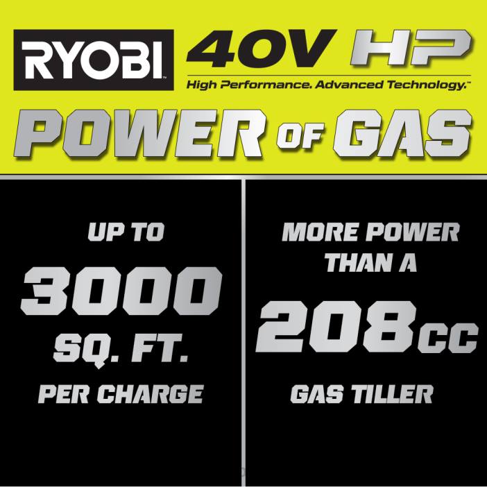 - 40v hp テクノロジーは、208cc ガス耕耘機よりも多くの電力を供給します