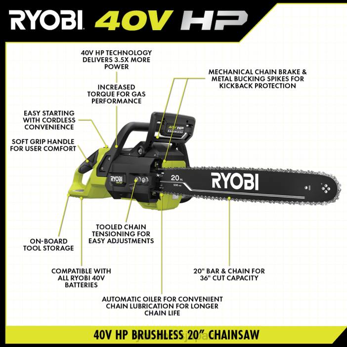 40v hp ブラシレス 20 インチ チェーンソー キットを使用して、Ryobi 40v システムに参加してください。40v hp テクノロジーは、50cc ガス チェーンソーよりも高い出力を提供し、このチェーンソーを真のガス代替品にしています。このチェーンソーは、1 回の充電で 100 回以上の切断が可能で、高級フルコンプリメント チェーンが装備されています。40 V テクノロジーは、ブラシレス モーター、高度なエレクトロニクス、高性能リチウム テクノロジーを組み合わせて、より多くのパワー、より長い稼働時間、より速い切断、より優れた耐久性を提供します。 「バーとチェーンのタックルは最大 36 インチまで切断できるため、伐採、切り倒し、枝払いに最適です。このチェーンソーには、チェーンの寿命を延ばすためにチェーンの潤滑を維持するための自動オイラーと、キックバック保護のための追加のメカニカル チェーン ブレーキが付いています。調整します。工具付きチャイを使用してチェーンを制御してきれいにカットしますオンボードツールストレージによるテンション調整。何よりも、これはリョービ 40v システムの一部であり、あらゆる 40v バッテリーがあらゆる 40v 製品で動作します。この 40v hp ブラシレス 20 インチ チェーンソー キットには、リョービの 5 年間のメーカー ツール保証、3 年間のメーカー バッテリー保証が付いており、ry405011 40v hp ブラシレス 20 インチ チェーンソー、op4080a 40v 8ah リチウム バッテリー、op406a 40v 急速充電器、鞘、コンビネーション レンチ、キャリー ケース、取扱説明書。