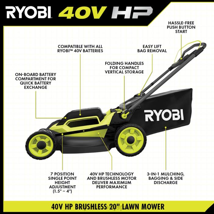 リョービ 40v hp ブラシレス 20 インチ プッシュ芝刈り機で 40v システムを開始します。40v hp テクノロジーを備えたこの芝刈り機は、150cc ガス芝刈り機よりも多くの電力を供給します。付属の 40v 6ah リチウム バッテリーは最長 48 分の稼働時間を提供し、最大 1/2 エーカーの作業に最適です。40v hp テクノロジーは、ブラシレス モーター、高度なエレクトロニクス、およびリチウム バッテリーを組み合わせたもので、芝刈り条件に自動的に反応し、ブレードを増加させます。行き詰まりを解消するスピードと、最も厳しいカットでもパワーを発揮します。一箇所の高さ調整により、芝生に最適な高さを素早く選択でき、ワンタッチで折りたためるハンドルにより、狭いスペースでも簡単に保管できます。簡単な操作でガスのパフォーマンスを体験してください。ボタンを押すだけです。何よりも、それはリョービ 40v システムの一部です。ここでは、40V バッテリーはすべて 40V 製品で動作します。この芝刈り機にはリョービの5年間のメーカー工具保証、3年間のメーカーバッテリー保証が付いており、ry401017 40v hpブラシレス20インチプッシュモア、op40605 40v 6ahリチウムバッテリー、op408 40v急速充電器、グラスキャッチャーバッグ、スタートキーが含まれています。 、マルチプラグ、側面排出シュート、および操作マニュアル。