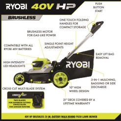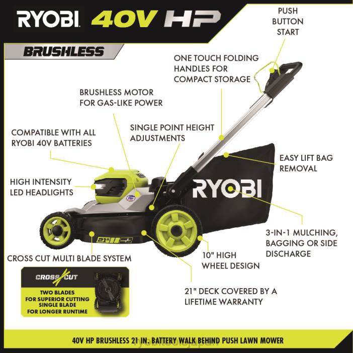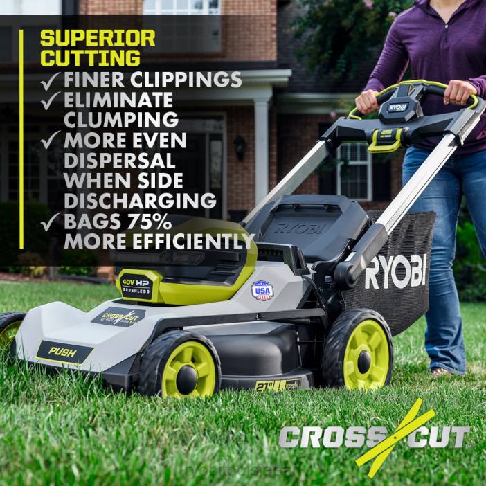 リョービ 40v hp ブラシレス 21 インチ マルチブレード コードレス プッシュ芝刈り機は、コードレスの利便性とガスの力を提供します。プレミアム hp ブラシレスモーターは、より多くのパワー、より長い稼働時間、より長いモーター寿命を提供します。ボタンを押すだけで始動し、ガソリン、オイル、メンテナンスの手間がかかりません。この芝刈り機は、最大 1/2 エーカーの庭に最適です。デュアル機能を備えています。アクティブバッテリーポートと最大50分間の稼働時間を提供する40ボルト7.5ahバッテリー。クロスカットマルチブレードシステムは、優れた切断性能を実現する2枚のブレード、またはより長い稼働時間を実現する1枚のブレードを提供します。耐久性のある21インチデッキは軽量です。 、腐食に強く、生涯保証が付いています。芝刈り機は高さ 10 インチの大きなホイール設計で操作が簡単で、デッキには 7 インチのホイールが付いています。単一ポイントの高さ調整により、草の高さを1.5インチから4インチの間で簡単に選択できます。 3-in-1 芝刈り機能を使用すると、袋詰め、マルチング、または側面排出機能から選択できます。簡単に持ち上げてシングルモーションでバッグを取り外すことができるため、素早く簡単にグラスキャッチャーバッグを空にすることができ、ワンタッチのアルミニウムハンドルを折りたたんでコンパクトに垂直に保管できます。この芝刈り機には、標準充電器よりも 4 倍の速さでバッテリーを充電する 40V 急速充電器が含まれています。この芝刈り機は、世界中の材料を使用して誇りを持って米国で製造されており、5 年間の工具保証が付いています。