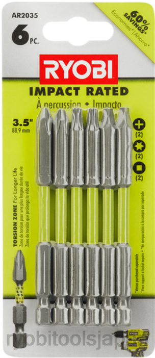 リョービのインパクト定格ドライビングビットは、インパクトドライバーの使用に伴う高トルクと要求に耐えるように作られています。各ビットは、多くの駆動用途でビットが受ける高トルクを吸収するように設計されたトーションゾーンを備えています。リョービの 6 点セットには、3-1/2 インチのプラス、星形、四角ビットが含まれています。