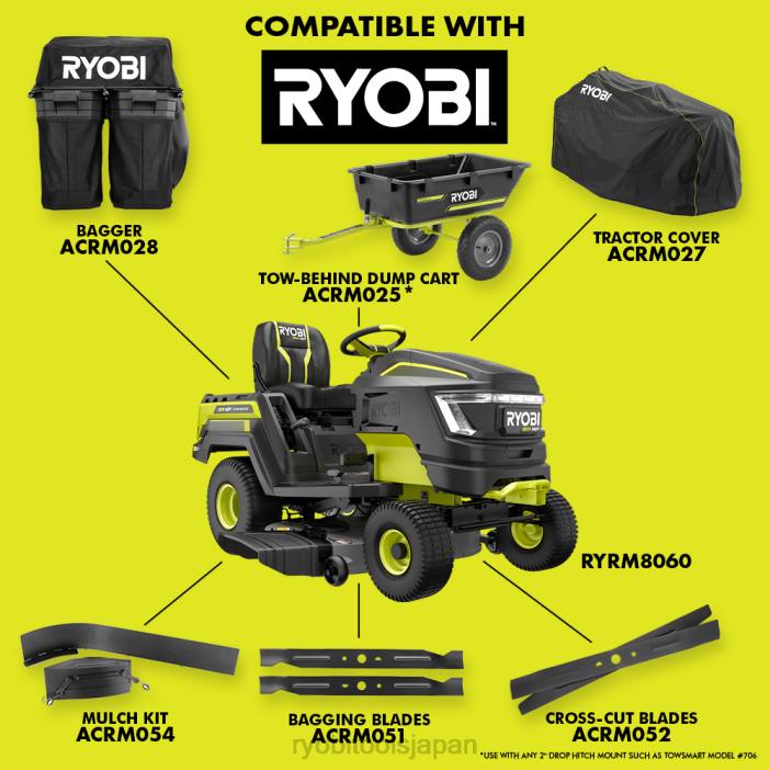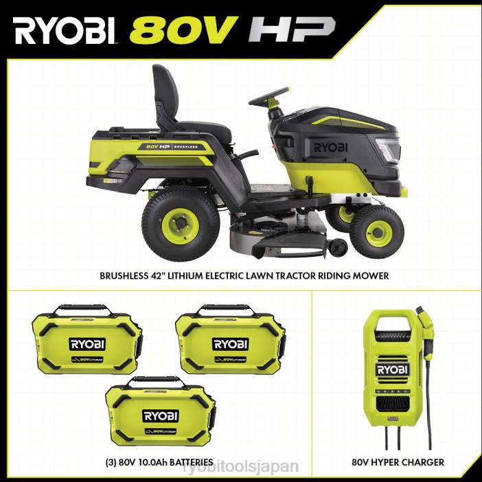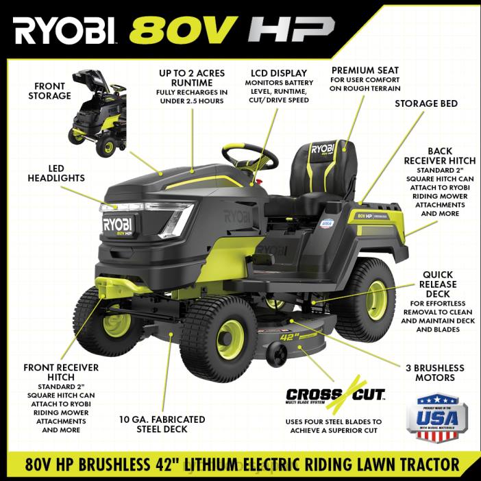 リョービ初のリチウムイオン電池駆動の乗用芝生トラクター、リョービ 80v 馬力 42 インチ リチウム電動乗用車のご紹介芝生トラクター。80v 馬力テクノロジーは、ブラシレス モーター、高度なエレクトロニクス、リチウムイオン バッテリーを組み合わせて、21 馬力のガス エンジン* と同等の出力を提供し、ガスやエンジンのメンテナンスを必要とせずにすべてのパワーを供給し、騒音を大幅に低減します。このトラクターは、 3 つのブラシレスモーターと 3 つの 80v 10ah バッテリーで駆動され、1 回の充電で最大 2 エーカーの作業を行うことができます。作業が完了すると、付属のハイパーチャージャーとオンボード充電ポートを使用して、トラクターは 2.5 時間以内に完全に充電されます。業界の芝生トラクターには、前後に収納コンパートメントがあり、マルチ、丸太、植物、または庭の周りのあらゆる資材を運びます。耐荷重500ポンドで牽引作業も素早く行えます。トラクターの前後にはユニバーサル 2 インチ スクエア ヒッチが装備されています。トラクターには 10 ゲージの頑丈な加工スチール デッキと、優れた切断を実現するために 4 枚のスチール ブレードを使用するクロスカット マルチブレード システムが装備されています。 90 秒以内にデッキを取り外して、ブレードのメンテナンスを迅速に行うことができます。フルカラーのバックライト付き液晶画面には、実行時間、バッテリーレベル、充電ステータスが表示され、リョービ乗用芝刈り機アプリを使用すると、携帯電話から充電ステータスを監視できます。一部の地域でモバイルサービスが利用可能です。 . 乗用芝刈り機に注意が必要な場合は、認定リョービ サポート技術者がご自宅から診断とサービスを行うことができます。一部のサービスでは、全国 300 以上のサービス センターの 1 つに芝刈り機を持ち込む必要がある場合があります。このトラクターは誇りを持って米国で製造されています。世界中から調達された素材を使用しており、5 年間の限定保証が付いています。