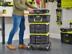 リョービ リンク モジュラー ストレージ システムはストレージ業界に革命をもたらし、日常生活の整理、アクセス、持ち運びを可能にします。リョービ リンク ローリング ベースは耐衝撃性素材を使用して設計されており、200 ポンドの耐荷重に耐え、スタックを外出先に持ち運ぶことができます。回転キャスターと滑らかに回転するゴム製ホイールにより、作業スペース内でのシームレスな移動が可能になります。ロック可能な前輪キャスターと統合されたタイダウンポイントにより、ベースをどの位置でも安全に保ちます。ハンドルを使用すると、ベースを簡単に持ち上げて効率的に吊るすことができます。何よりも、これは同じロック技術を使用してモバイルストレージと固定ストレージのニーズをシームレスに接続するリョービリンクモジュラーストレージシステム製品ラインの一部です。リョービ リンク モジュラー ストレージ システムで自分のスペースを所有しましょう。