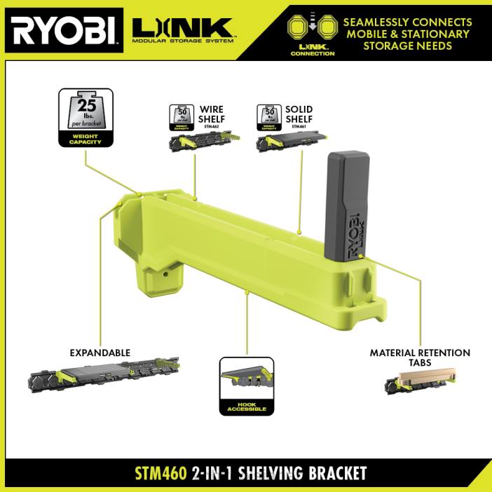 リョービ リンク モジュラー ストレージ システムはストレージ業界に革命をもたらし、日常生活の整理、アクセス、持ち運びを可能にします。リョービ リンク 2-in-1 棚ブラケットは、長い建材を保管したり、棚に変えたりできるように設計されています。材料保持タブを利用して、PVC、木材、だぼ、ロッドなどをしっかりと保持したり、ブラケットをリンク 21 インチ ソリッド シェルフまたはリンク 21 インチ ワイヤー シェルフと組み合わせたりできます。 2 つの 2-in-1 ブラケットを使用して 1 つのシェルフを保持するか、3 番目のブラケットを追加して 2 つのシェルフを隣り合わせに保持し、中央のブラケットを共有します。追加のブラケットとシェルフを続けて 1 つ追加して、シェルフ システムを拡張し続けます。何よりも、これはリョービ リンク モジュラー ストレージ システム製品ラインの一部であり、同じロック技術を使用して、ストレージ システムをシームレスに接続します。可動式および固定式のストレージのニーズ。リョービ リンク モジュラー ストレージ システムでスペースを所有しましょう。