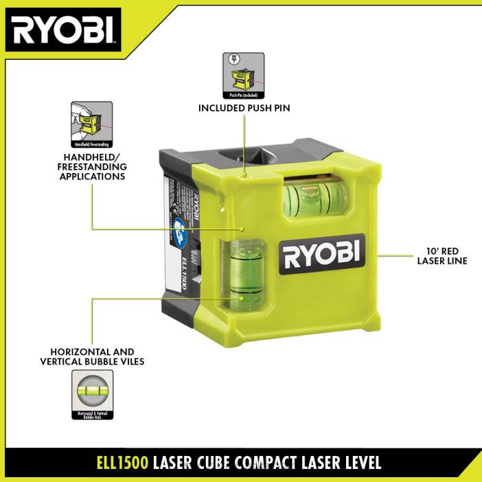 リョービ レーザー キューブは手持ち式の自立型レーザーです。そのサイズ、携帯性、精度により、家庭用品として最適です。リョービ レーザー キューブは、正確なレベリングを実現する水平および垂直バブル バイアルを備えています。押しピンが付属しているので、表面に直接簡単に取り付けることができます。取り外し可能な粘着ストリップ (別売り) も、レーザー キューブの取り付けに最適なオプションです。