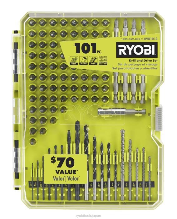 ryobi101 パソコン。ドリルとドライブのセットは、幅広い用途をカバーするためのさまざまなビットを備えた独自の設計です。このセットは、木材、金属、プラスチック、石材への穴あけに最適です。付属の黒色酸化ビットにより長寿命です。1 インチ。ビットは磁気ビット ホルダーに完全にフィットし、制御が強化されます。これらの頼りになるステープルとさまざまなブラッドポイント ビット、および石材ビットを使用すると、あらゆるプロジェクトに最適なアクセサリが確実に手に入ります。すべてのビットは多用途のケースに便利に保管できます。