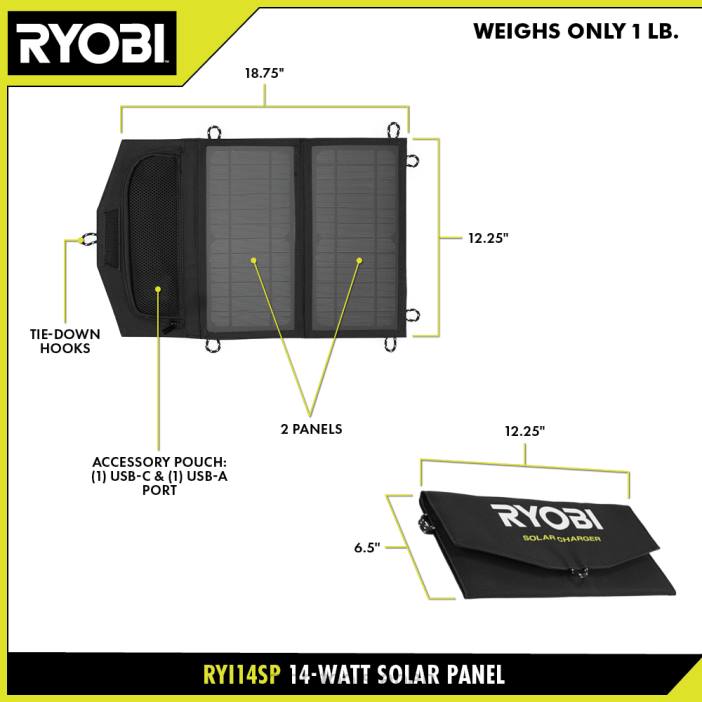 リョービ 14 ワットの折りたたみ式ソーラー パネルは、USB-A または USB-C ポートを備えた小型電子機器に太陽光から直接電力を供給します。互換性のあるリョービ電源と組み合わせることで、携帯電話、タブレット、パワーバンク、スピーカー、さらにはリョービ 18v one+ バッテリーに電力を供給するのに最適です。 ryobi 18v one+ 2ah バッテリーを 4 時間以内に充電でき、携帯電話をわずか 2 時間 20 分で充電できます。 14 ワットのソーラー パネルは、電源の可搬性を最大限に高めます。重さはわずか 1 ポンドで、折りたたんだときのサイズは 12.15 インチ x 6.5 インチです。コンパクト、軽量、折りたたみ可能なデザインにより、保管や持ち運びが簡単になるため、ハイキング、キャンプ、ビーチなど、ポータブル電源が必要な太陽の下ならどこでも、デバイスを充電するために持ち運ぶことができます。それはオペかもしれません地面に平らに設置して日照時間のピーク時に光を取り込むことも、(7) 統合された吊り下げループを使用してさまざまな角度で吊り下げて、取り込む光の量を最大化することもできます。リョービ 14 ワット ソーラー パネルにはリョービ 3 年間のメーカー保証が付いており、ryi14sp 14 ワット折りたたみ式ソーラー パネルと取扱説明書が含まれています。