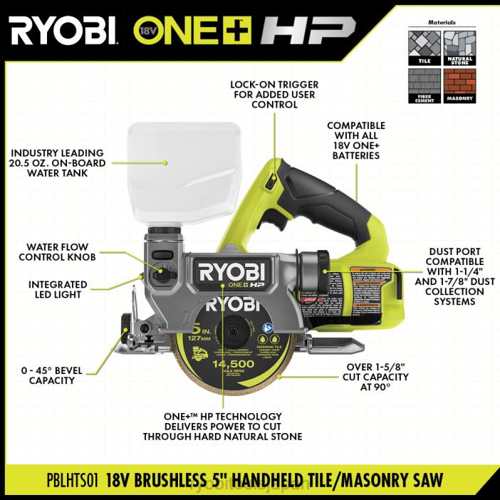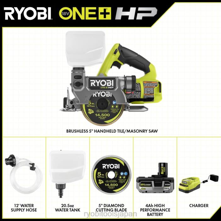 18v one+ hp ブラシレス 5 で ryobi 18v one+ システムを強化します。 ” ハンドヘルド タイル/石材のこぎりキット。one+ hp テクノロジーは、ブラシレス モーター、高度な電子機器、高性能リチウム テクノロジーを利用して、より多くのパワー、実行時間、耐久性、速度を実現します。one+ hp テクノロジーの力により、この鋸は硬い天然石を切断するパフォーマンスを実現します。さらに、1 回の充電で 100 直線フィートを超える切断能力* を備えているため、自信を持って大規模なプロジェクトに取り組むことができます。この鋸には、業界をリードする粉塵低減のための 20.5 オンスのオンボード水タンクと、12 フィートの無制限の水流を実現する給水ホース、水流量を調整できる水流制御ノブ、ロックオントリガーと 0 ~ 45 度のベベル容量さらなる多用途性を提供します。ダストポートは1-1/4インチおよび1-7/8インチの集塵システムと互換性があり、統合されたLEDライトにより視認性が向上します。タイルや石材のプロジェクトで作業を遅らせないでください。今すぐリョービ 18v ブラシレス 5 インチ ハンドヘルド タイル/石材ソーを手に入れて、より多くの作業を行うためのパワーを体験してください。何よりも、これはリョービ one+ システムの一部です – 18v one+ バッテリーならどれでも使えますあらゆる 18v one+ 製品で動作します。この鋸にはリョービの 3 年間メーカー保証が付いており、18v ハンドヘルド タイル/石材のこぎり、12 フィート給水ホース、20.5 オンス水タンク、5 インチ ダイヤモンド切断ブレード、アーバー レンチ、18v が含まれています。 4ah リチウム高性能バッテリー、充電器、取扱説明書。