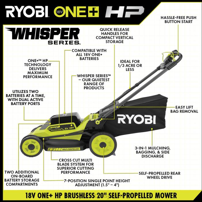 Ryobi one+ 18v hp ブラシレス 20 インチ セルフで 18v one+ システムに参入推進式芝刈り機。革新的な one+ hp テクノロジーを搭載したこの芝刈り機は、150cc ガス芝刈り機よりも多くのパワーを供給しながら、ガス芝刈り機より 60% 静かで、他のコードレス芝刈り機よりもさらに静かです。付属の 18v one+ 4ah バッテリー (4 個) を使用すると、この芝刈り機は最大 45 分間の稼働時間を提供し、最大 1/3 エーカーの芝生に最適です。クロスカット マルチブレード システムは優れた切断を実現し、業界最高の袋詰め、マルチング、側面排出を実現します。one+ hp テクノロジーを組み合わせています。ブラシレスモーター、高度なエレクトロニクス、高性能リチウムテクノロジーが連携して、ボタンを押すだけで最も過酷な切断でも刃の速度とパワーを向上させます。eスピード自走式ドライブシステムにより、楽で効率的な草刈り体験が保証されます。コンパクトに収納できる簡単に折りたためるハンドル、一点で高さ調整、簡単に持ち上げてバッグを取り出せるなどの機能を備え、草刈りや保管がこれまでになく簡単になりました。何よりも、これは ryobi 18v one+ システムの一部であり、どの 18v one+ バッテリーでも、どの 18v one+ 製品でも動作します。キットには、p11011 18v one+ hp ブラシレス 20 インチ芝刈り機、(4) pbp005 18v one+ 4ah リチウム電池、(2) p117 18v one+ 急速充電器、グラスキャッチャーバッグ、マルチプラグ、スタートキー、側面排出シュート、および操作マニュアルが含まれています。 .