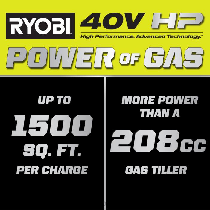 - 40v hp テクノロジーは、208cc ガス耕耘機よりも多くの電力を供給します