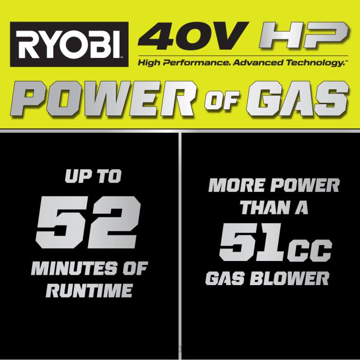 - 40v hp テクノロジーは、51cc ガスブロワーよりも多くの電力を供給します