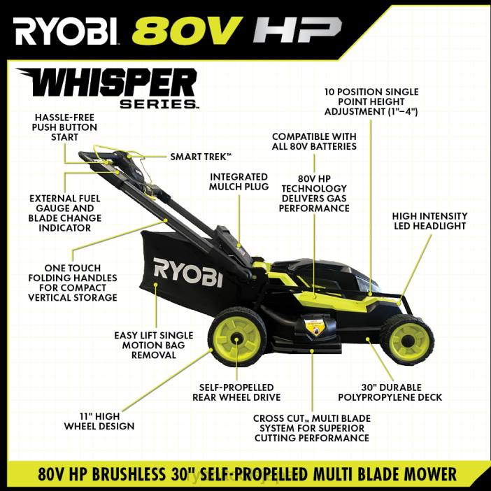 リョービ 80v 馬力ブラシレス 30 インチ ウィスパー シリーズ クロスカット芝刈り機は、80v 馬力テクノロジーを利用して、リョービ 80v バッテリー電源の容易さでガスよりも効率的な切断体験を提供します。80v 馬力この技術により、ガス性能が 35% 向上し、この新しい 30 インチ芝刈り機は 223cc ガス芝刈り機よりも強力になります。リョービの最も静かな製品ラインアップであるウィスパーシリーズの一部として、この芝刈り機はガス芝刈り機よりも 70% 静かです。シンプルなプッシュボタンスタートで、ユーザーは付属のリョービ 80v 10ah リチウムバッテリーで最大 90 分の実行時間で最大 1 エーカーの作業に取り組むことができます。外部残量計は芝刈り中に残っているバッテリー残量を示し、充電時期になったら、付属の 80V ハイパーチャージャーを使用すると 1 時間以内にバッテリーを再充電できます。この芝刈り機はリョービの一部です80v hp ブラシレス ファミリのコードレス製品。作業が完了したら、リフトバッグを簡単に取り外せるので、刈った草を素早く空にすることができ便利です。ワンタッチ折りたたみハンドルにより、この芝刈り機を芝刈りセッションの合間にガレージや小屋の邪魔にならない場所に簡単に保管できます。高さ 11 インチのホイール設計と高輝度 LED ヘッドライトをウィスパー シリーズ エンジニアリングと組み合わせることで、ユーザーは夕暮れから夜明けまでいつでも芝刈りを行うことができます。この芝刈り機には 5 年間のメーカー保証が付いています。