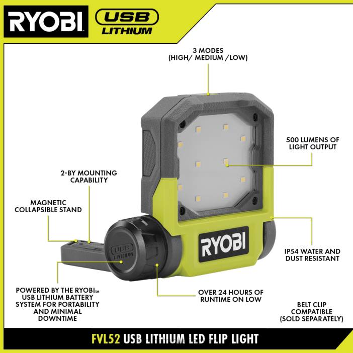 ryobi は、USB リチウム LED フリップ ライト キットを紹介します。このライトは 500 ルーメンを提供し、毎回必要な理想的な光量を提供する 3 つのライト モードを備えています。ピボットスタンド、磁気ベース、2 バイ取り付け機能を使用して、ライトを必要な場所に正確に取り付けて方向付けることができます。このライトは 24 時間以上鮮明にカバーします。防水性と防塵性の IP54 等級を備えたこのライトは、最も過酷な条件にも耐えられるように作られています。 USB リチウム LED フリップ ライト キットは、コードレス電源と生産性のためのコンパクトでポータブルな充電式ソリューションを提供する USB リチウム システムの一部です。この USB リチウム LED フリップ ライト キットには、リョービの 2 年間のメーカー保証が付いており、(1) fvl52 LED フリップ ライト、(1) fvb01 usb リチウム 2ah バッテリー、USB ケーブル、および取扱説明書が含まれています。